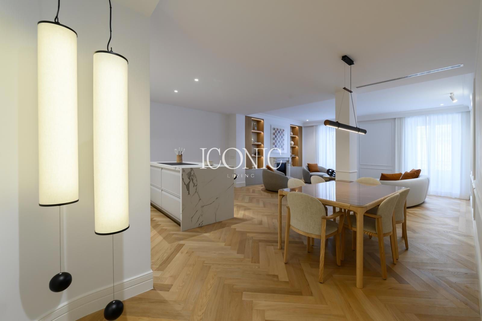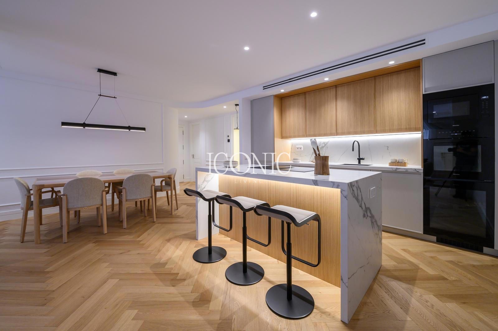 La sala, el comedor y la cocina se han integrado en un solo ambiente abierto, creando un espacio fluido que invita a disfrutar de reuniones y momentos familiares. La cocina amueblada incluye mobiliario de la reconocida marca BANNI, conocido por su diseño contemporáneo y su alta calidad. Este detalle subraya el compromiso de la propiedad con la excelencia y el buen gusto.