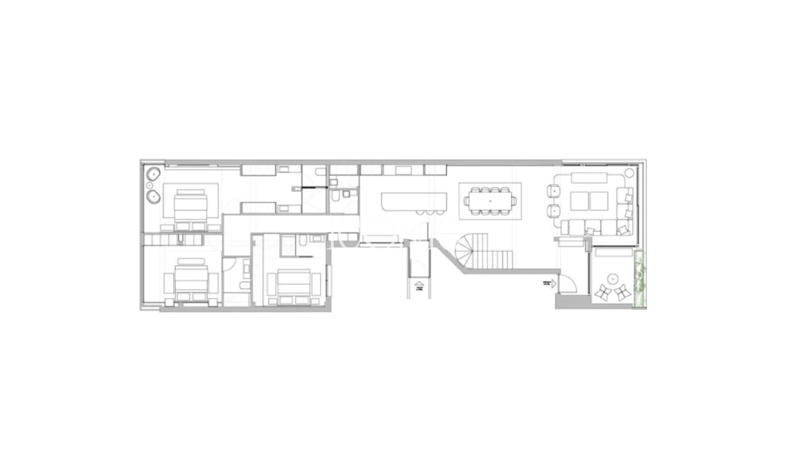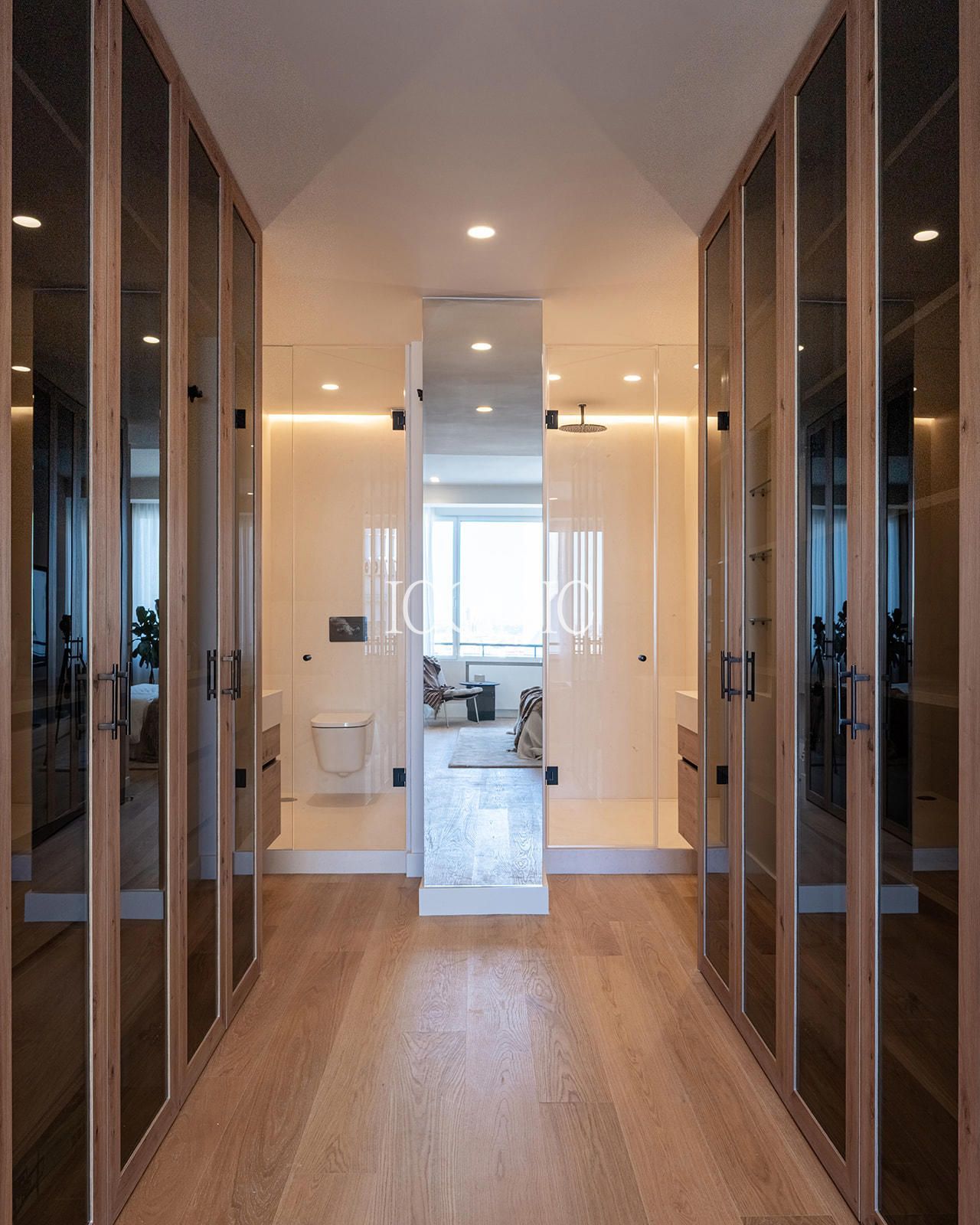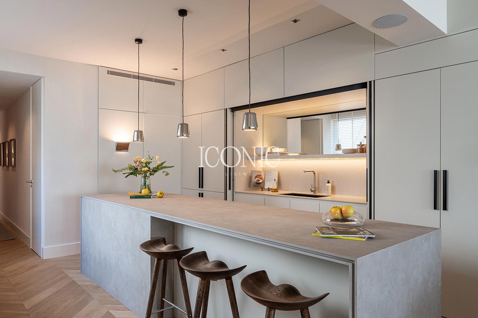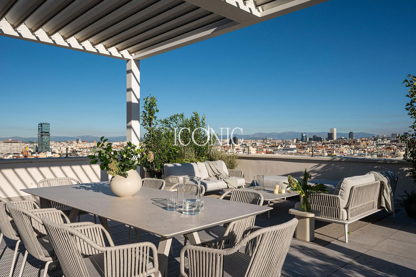 En la planta principal, los espacios se distribuyen de manera funcional y elegante: una gran cocina con isla equipada con sistema cooking surface, un comedor para ocho personas y un salón con vistas espectaculares que conectan directamente con la terraza exterior. Las tres habitaciones en suite aportan privacidad y confort, destacando la máster con vestidor propio y vistas directas al skyline madrileño. A esto se suma un aseo de cortesía y un práctico espacio de lavandería independiente.